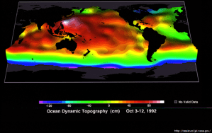 Hoy en día se mide el nivel del mar directamente mediante mareógrafos y satélites que descifran la topografía o variación en la elevación de la superficie del océano. Así es, el nivel del mar está realmente desnivelado. Su superficie exhibe lomas y depresiones leves debido a las irregularidades en la atracción gravitatoria ejercida sobre el océano en diferentes partes de la Tierra y a factores como las corrientes marinas y mareas. Este hecho es un reto interesante para los científicos. Para poder medir y entender el nivel del mar en cualquier parte del planeta necesitamos un marco de referencia. Los agrimensores, geólogos y oceanógrafos han resuelto este problema combinando los datos de los mareógrafos y satélites con un marco de referencia matemático llamado geoide. El geoide asume que el océano, en estado de reposo, tiene una superficie que se ajusta a la atracción gravitatoria del planeta y que no se ve afectada por las mareas ni corrientes marinas. Esa superficie se utiliza entonces como base para medir los cambios en el nivel del mar.