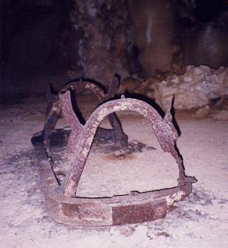 Evidencia de la minería de guano en Cueva Lirios, Isla de Mona, Puerto Rico. Foto tomada por P. A. Llerandi-Román, 2000.