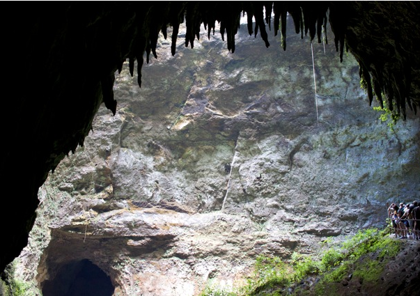 Estalactitas colgando del techo de Cueva Clara, entre Camuy, Quebradillas y Hatillo, Puerto Rico. La bóveda de Cueva Clara termina en un sumidero cilíndrico con entrada a otra caverna (al fondo). Foto tomada por Daniel Laó-Dávila, 2012.