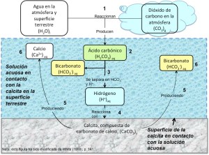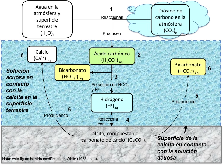 Proceso de la carsificación en rocas calizas a nivel microscópico (g= gas, s=sólido, aq= solución acuosa). Esta figura ha sido modificada de White (1988), p. 141.